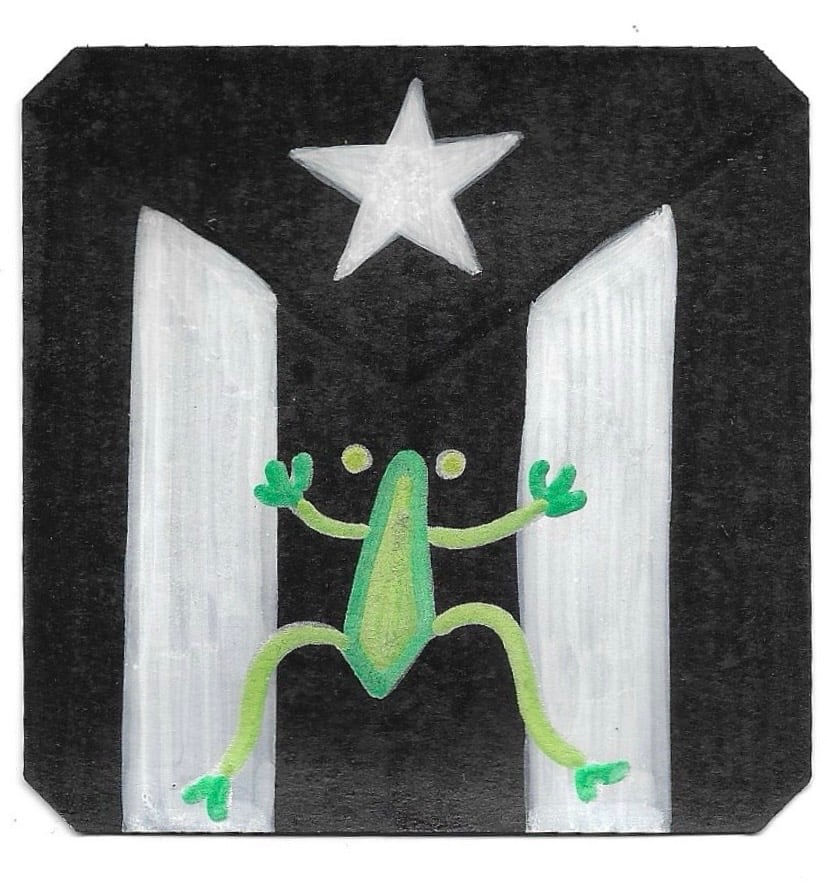 The symbol in this painting includes the coqui (frog). The Puerto Rican flag is represented in this tribal painting by Orquidia (Orchid) Rivera Ramos Arman! With this painting comes an additional painting behind it and the glass frame is included for free. 4 x 4 inches. Only currently shipping within the U.S and Canada.