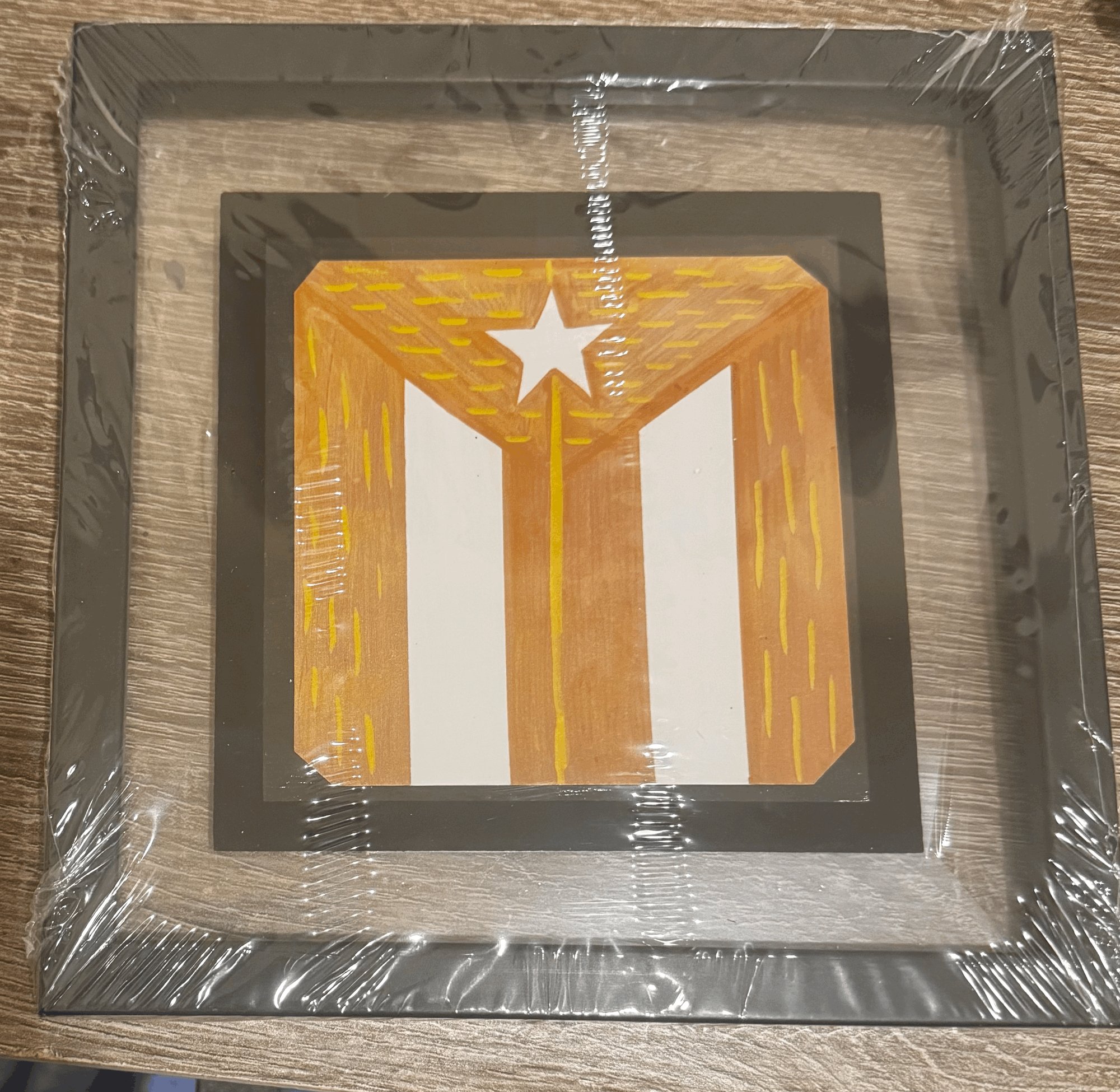 The Gold Door Puerto Rican flag is represented in this tribal painting by Orquidia (Orchid) Rivera Ramos Arman! With this painting comes an additional painting behind it and the glass frame is included for free. 4 x 4 inches. Only currently shipping within the U.S and Canada.