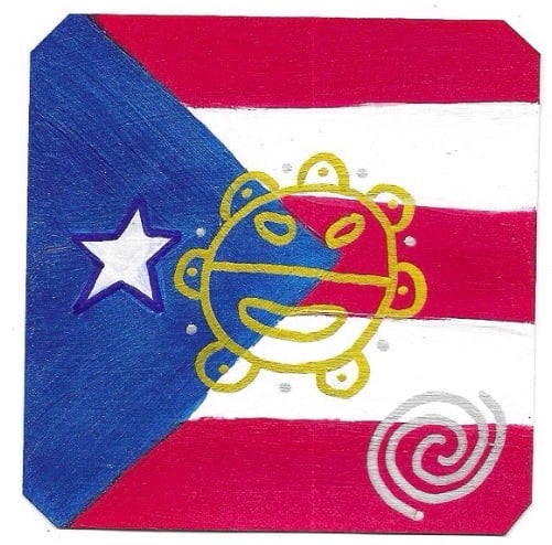 The symbols in this painting include the sun and sea/water. The Puerto Rican flag is represented in this tribal painting by Orquidia (Orchid) Rivera Ramos Arman! With this painting comes an additional painting behind it and the glass frame is included for free. 4 x 4 inches. Only currently shipping within the U.S and Canada.