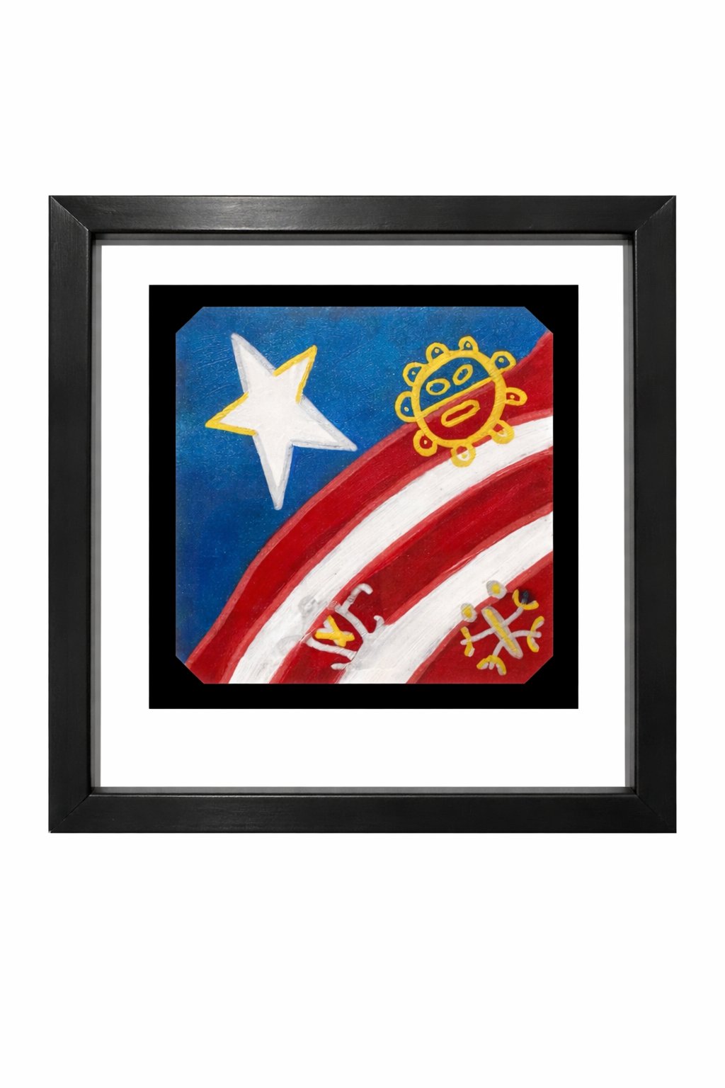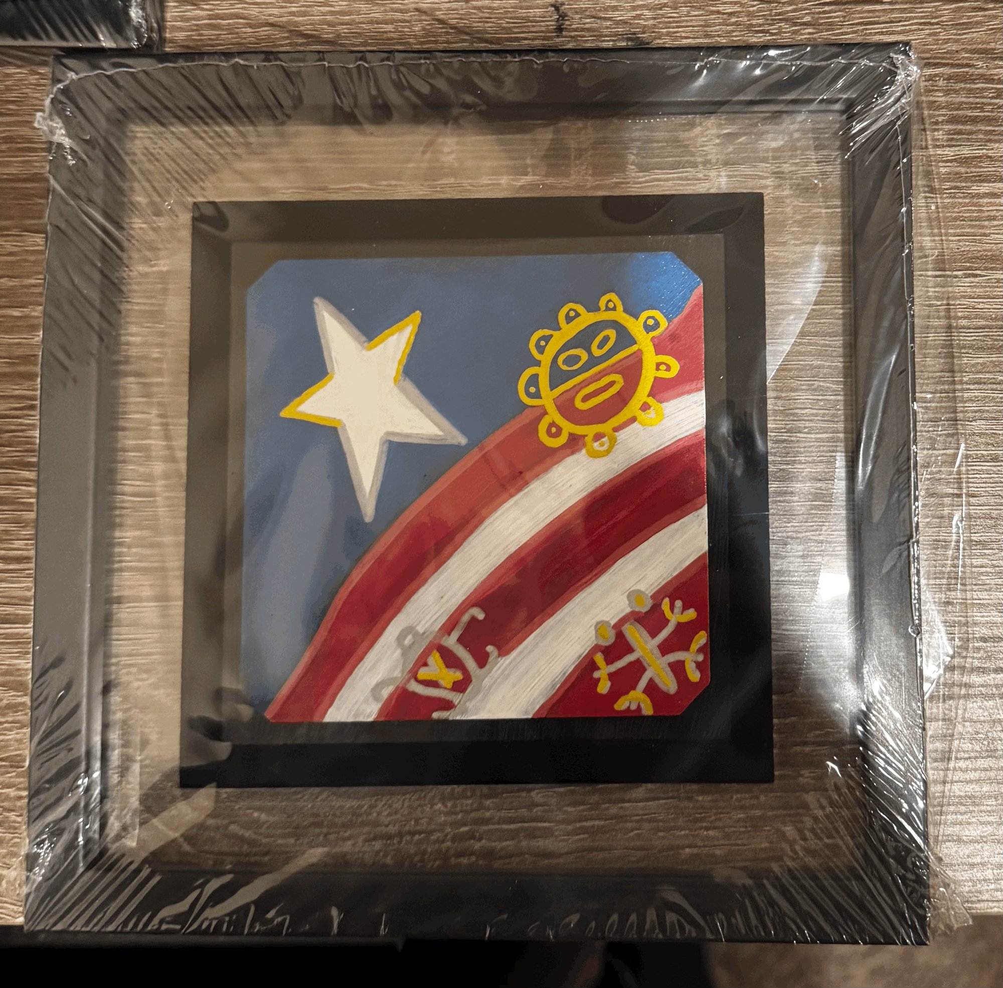 The symbols in this painting include the sun, turtle and coqui (frog). The Puerto Rican flag is represented in this tribal painting by Orquidia (Orchid) Rivera Ramos Arman! With this painting comes an additional painting behind it and the glass frame is included for free. 4 x 4 inches. Only currently shipping within the U.S and Canada.