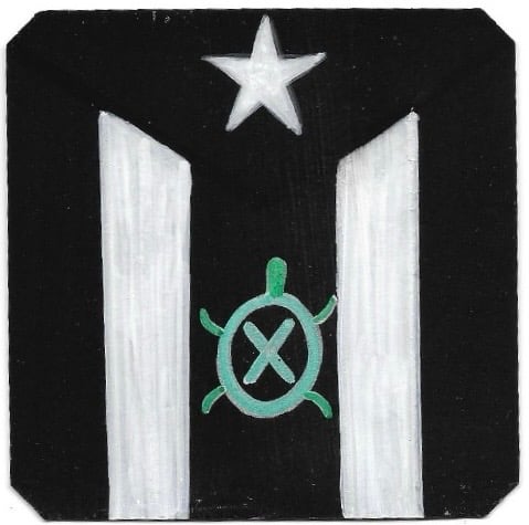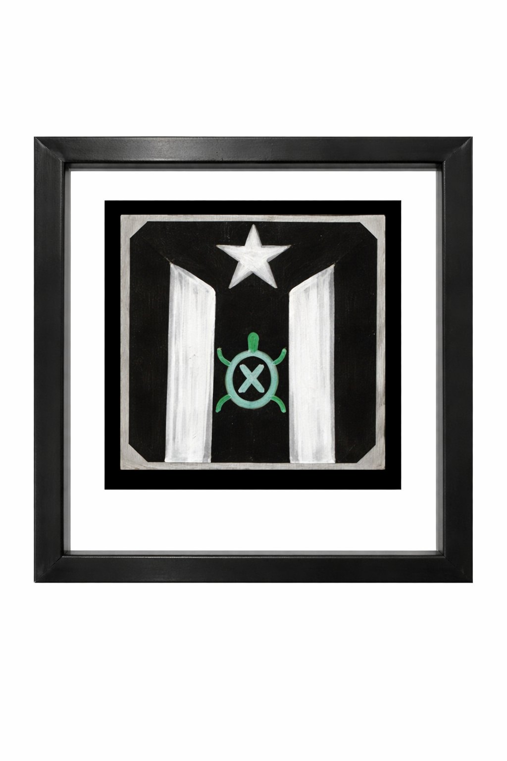The symbol in this painting includes the turtle. The Puerto Rican flag is represented in this tribal painting by Orquidia (Orchid) Rivera Ramos Arman! With this painting comes an additional painting behind it and the glass frame is included for free. 4 x 4 inches. Only currently shipping within the U.S and Canada.